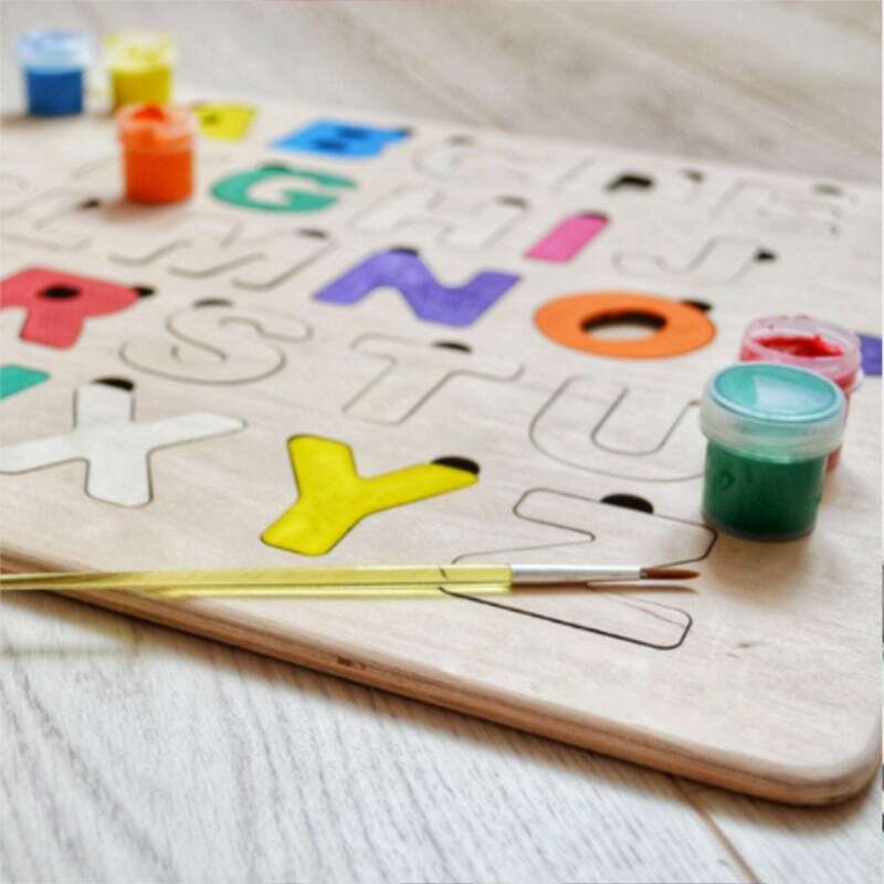 Puzzle Alfabet – duże litery wykonane w całości z drewna. Każda litera może być pomalowana ołówkami lub farbami.