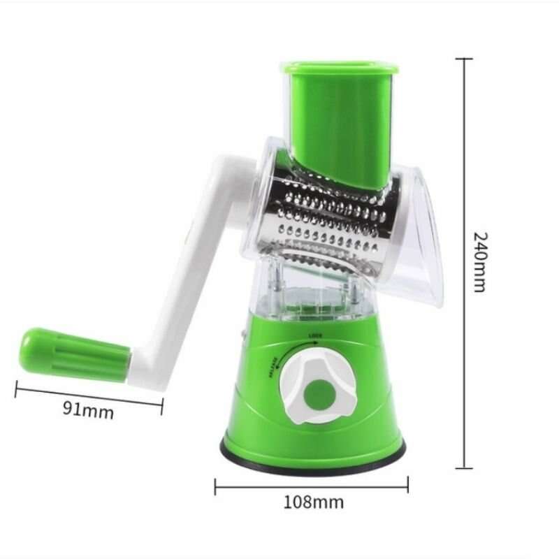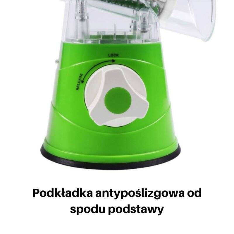 Używając ostrza, dociśnij warzywa do tarki i przekręć pokrętło względem siebie. Dzięki temu mechanizmowi z powstają tarte lub pokrojone warzywa. Możesz zetrzeć cokolwiek np. ser na pizze, czy makaron, bułki na bułkę tartą lub warzywa na surówkę.