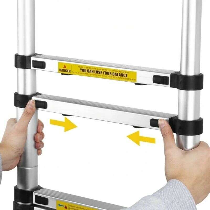 Możliwość szybkiej zmiany długości lub wysokości roboczej, zginania na pół, skracania każdego końca indywidualnie, co czyni je idealnymi do pracy na schodach lub nierównych powierzchniach. Wytrzymałe podkładki gumowe zapewniają doskonałą odporność na zużycie i zapewniają pewny chwyt na powierzchniach roboczych bez zarysowań. Stabilizator zapewnia jeszcze większą stabilność i sztywność podczas użytkowania drabiny.