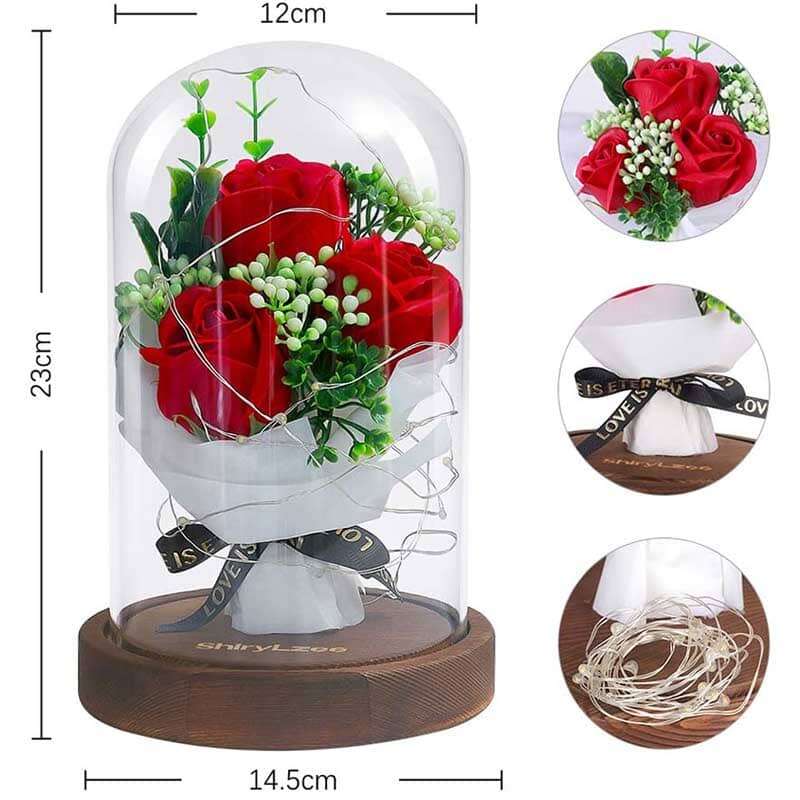 Nie wymaga pielęgnacji aby cieszyć swoim wyglądem. Zarówno główka róży, łodyga jak i liście róży są prawdziwe i poddane procesowi utrwalenia. Przedmiot zakonserwowany, kwiat róży wykonany jest z najwyższej jakości materiału różanego, wysokiej klasy kwiatu i doskonałego szkła klarownego i wykonany przez kompetentnego technika.
